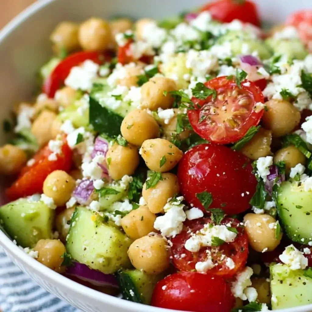 A vibrant and refreshing salad packed with protein-rich chickpeas, creamy avocado, tangy feta, and crisp vegetables, all tossed in a zesty lemon-herb dressing. Perfect as a light meal or a flavorful side dish.