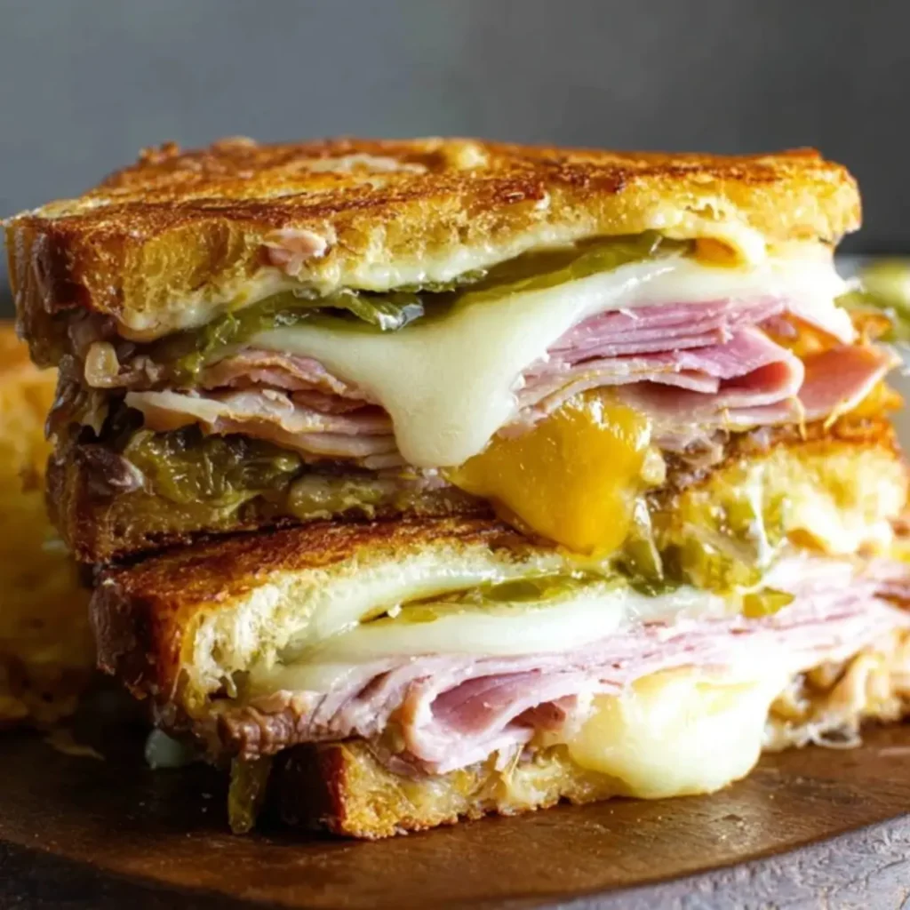 A delicious Cuban Sandwich cut in half and stacked, showing layers of ham, melted cheese, and pickles on grilled bread.