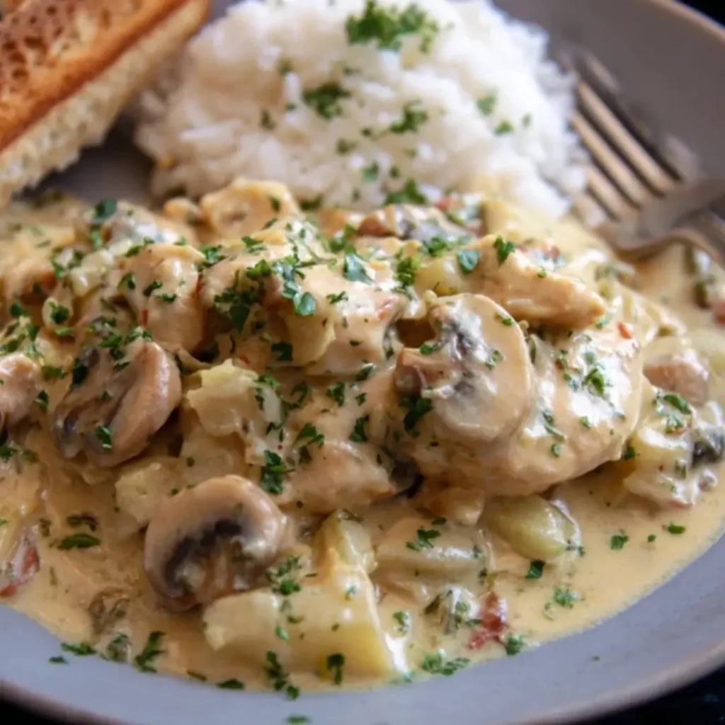 A rich and comforting chicken dish featuring tender chicken, mushrooms, and bell peppers in a luscious cream sauce, perfect served over toast, rice, or pasta for a satisfying meal.