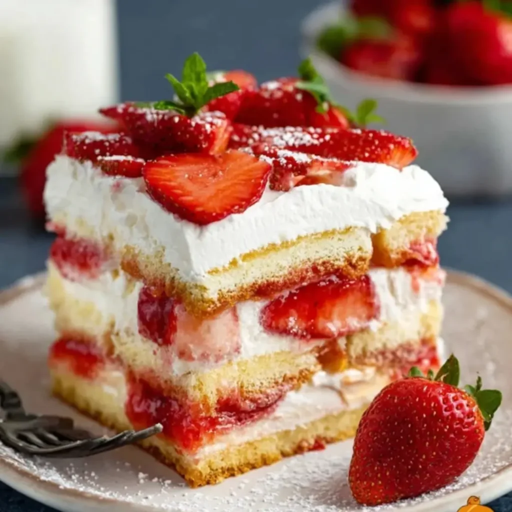 A refreshing and elegant no-bake dessert featuring delicate ladyfingers soaked in a homemade strawberry syrup, layered with a rich, creamy mascarpone mixture, and fresh strawberries. Perfect for a summer gathering!