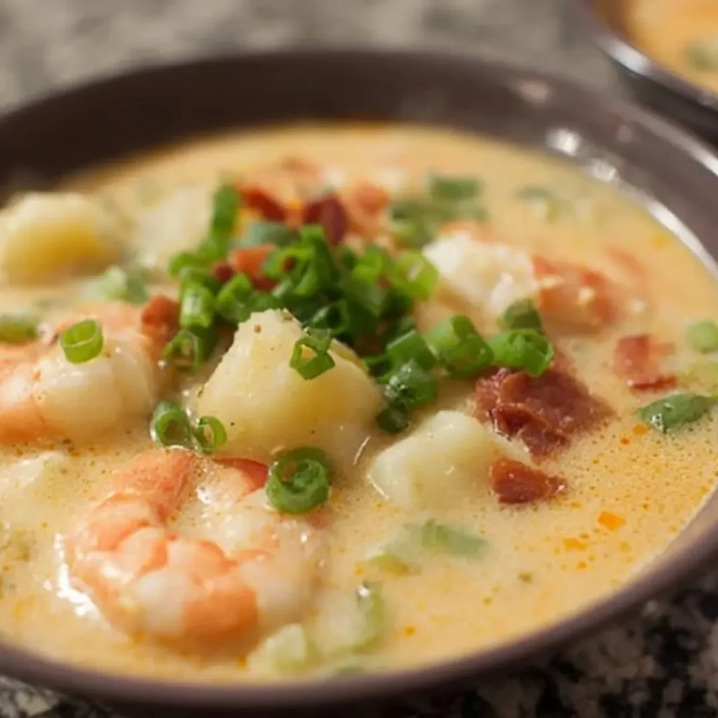 A rich and comforting shrimp chowder, loaded with tender shrimp, potatoes, corn, and savory vegetables in a creamy, flavorful broth. Perfect for a cozy meal any time of year.