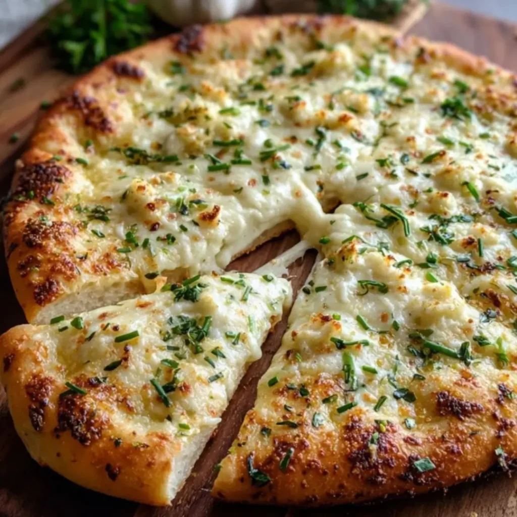 Close-up of a freshly baked white pizza cut into slices on a wooden board, topped with melted cheese and herbs.