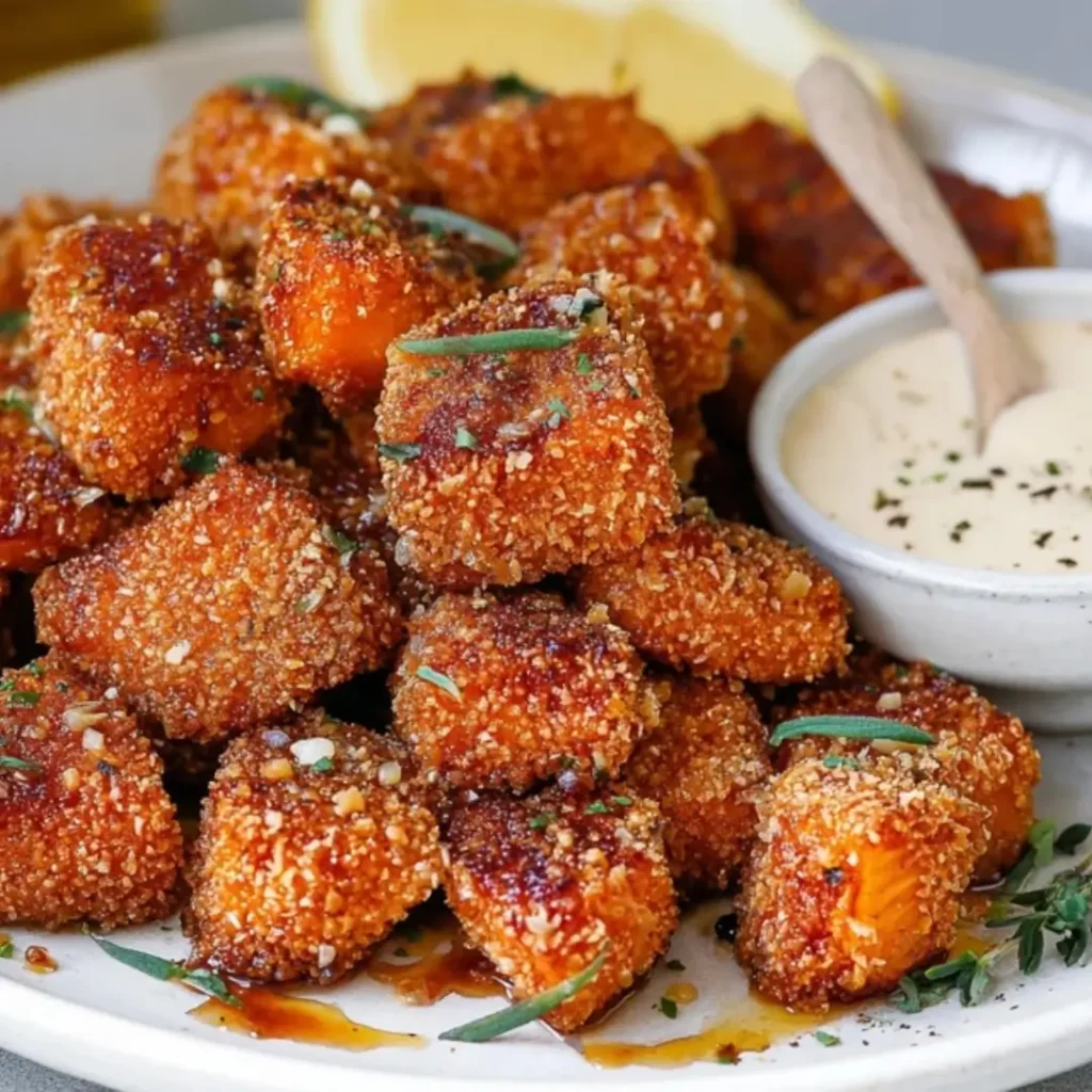 Close-up of golden Crispy Salmon Bites piled on a white plate with fresh rosemary and dipping sauce.
