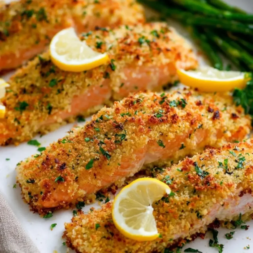 ![Golden crispy {{ $('Fetch Recipe Data').first().json["Main Keyword"] }} fillets on a dark platter garnished with lemon, parsley, and asparagus.](https://recipesdessert.net/wp-content/uploads/2026/04/crispy-parmesan-crusted-baked-salmon.webp)