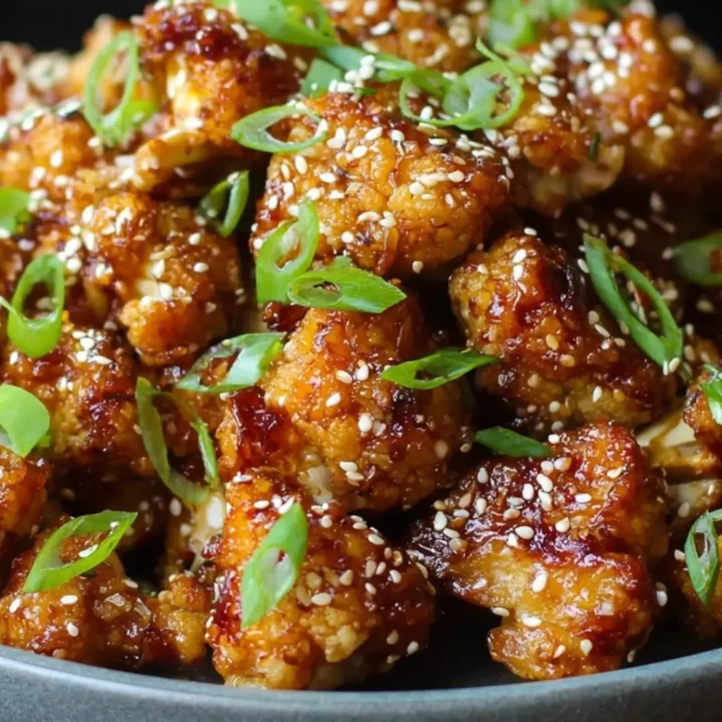 - Transfer the Crispy Sticky Sesame Cauliflower to a serving dish. Garnish generously with toasted sesame seeds and sliced green onions. Serve immediately, perhaps over rice or with steamed greens for a complete meal.