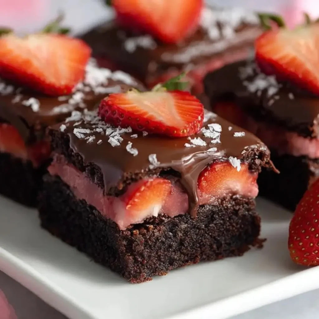Creating these beauties is a journey that’s incredibly rewarding, guiding you step-by-step to dessert perfection. First, you’ll prepare the fudgy brownie base, filling your kitchen with that irresistible chocolate aroma. Next, a sweet and simple strawberry layer comes together, adding a burst of freshness. Then, it’s all about assembling and baking these layers to gooey perfection. Finally, we crown our masterpiece with a smooth, glossy chocolate ganache topping, ready to be sliced and savored.