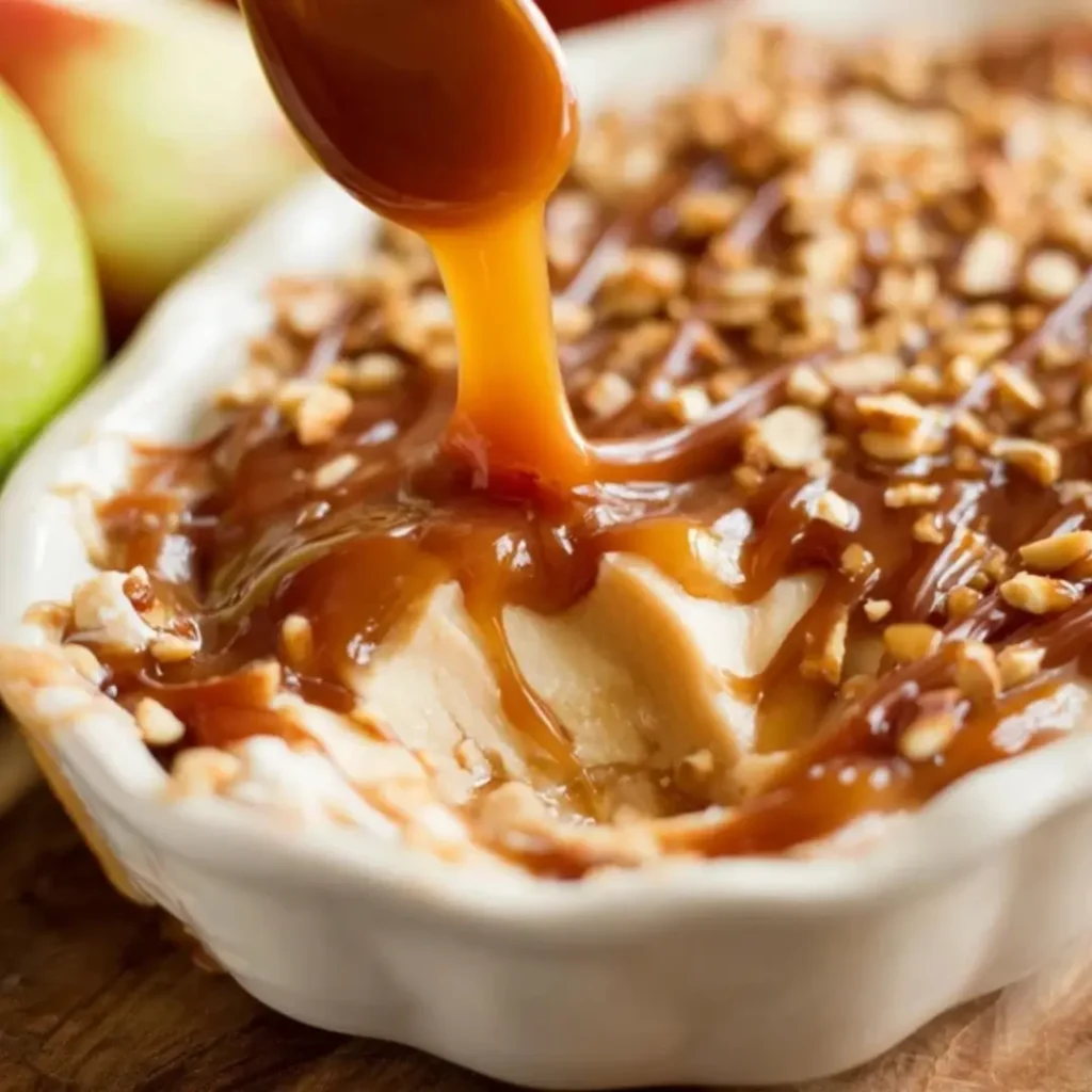 - If desired, sprinkle with chopped pecans or peanuts. Arrange fresh apple slices around the dip for serving. Serve immediately and let guests scoop the creamy, caramel goodness with their apple slices.