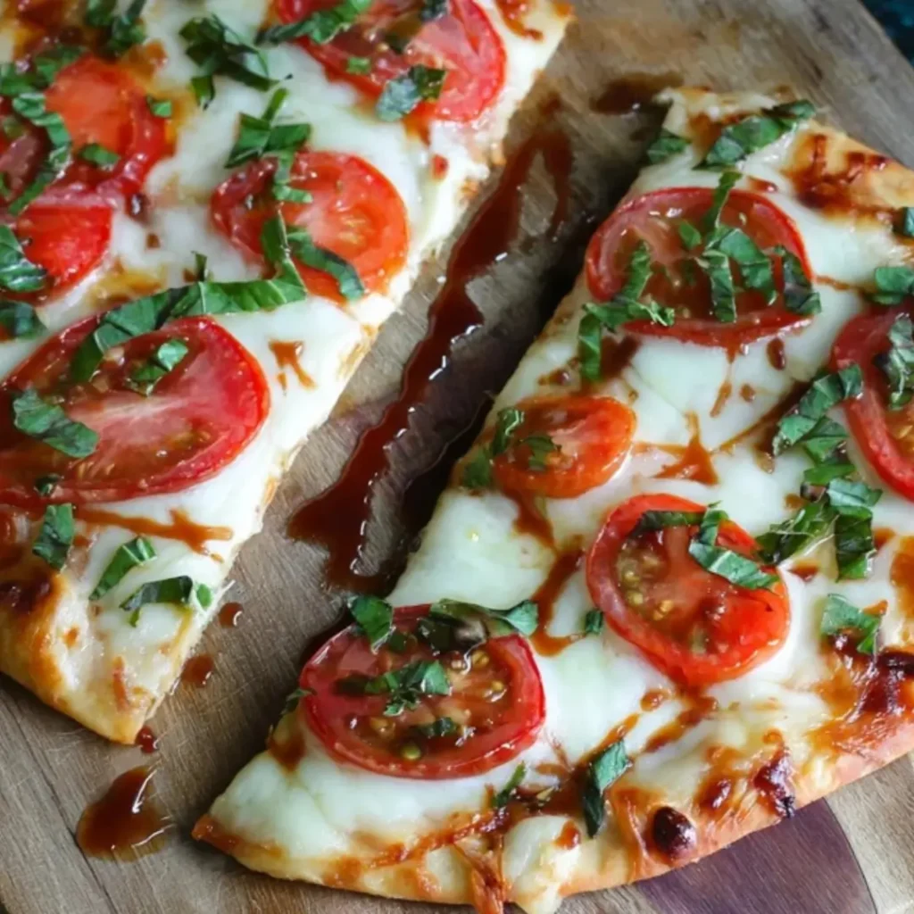 A delicious Caprese flatbread pizza sliced on a cutting board, topped with mozzarella, tomatoes, fresh basil, and a balsamic drizzle.