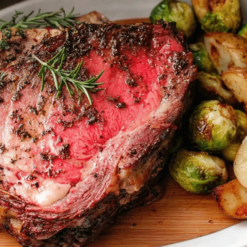 A perfectly cooked slice of meat from a garlic herb prime rib recipe, served with roasted potatoes and brussels sprouts.