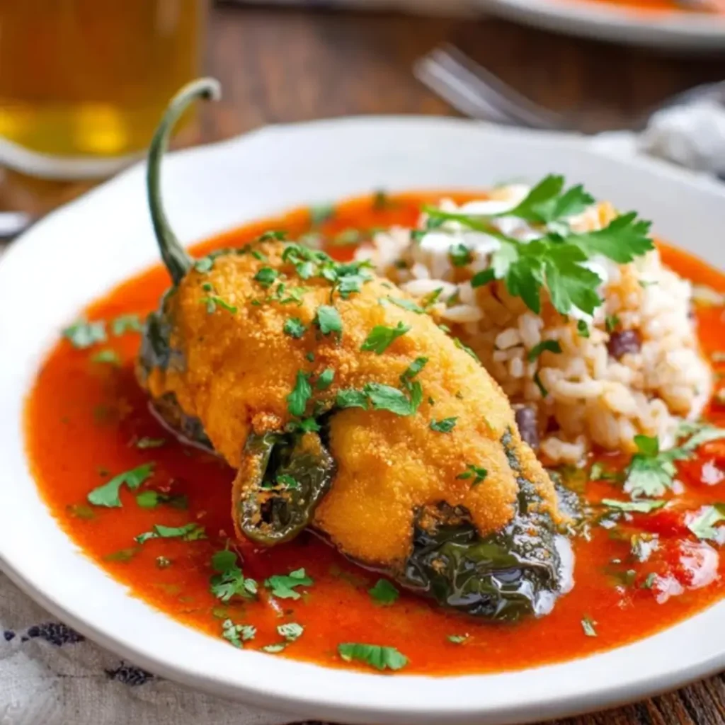 - To serve, place one or two Chiles Rellenos on a plate. Generously ladle the warm tomato sauce over them. Garnish with fresh chopped cilantro and a drizzle of Mexican crema or sour cream, if desired. Serve immediately with rice and beans.