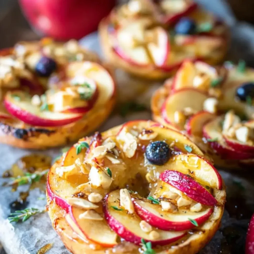 Sweet and crispy, these Mini Apple Pizzas feature thinly sliced apples on a golden puff pastry base, brushed with a cinnamon-sugar butter, then drizzled with rich caramel and a sprinkle of nuts. They make a delightful individual dessert or snack.