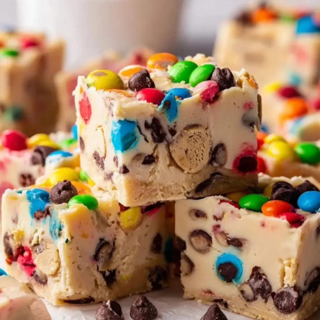 Stack of thick, creamy M&M cookie dough fudge squares loaded with colorful candies and chocolate chips on a wooden board.