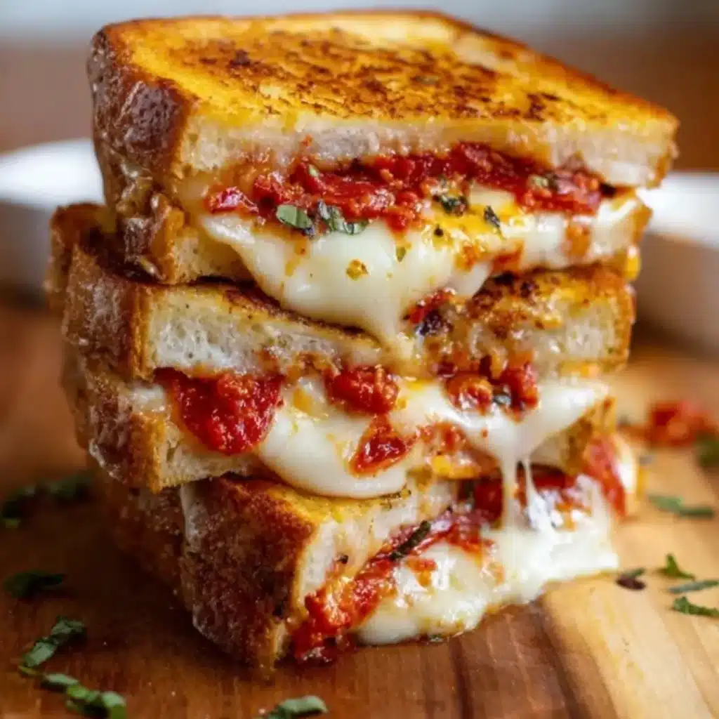 A delightful mashup of two comfort food favorites, this Pizza Grilled Cheese features crispy buttery bread, melted mozzarella and provolone, tangy pizza sauce, and savory pepperoni, all griddled to golden perfection.
