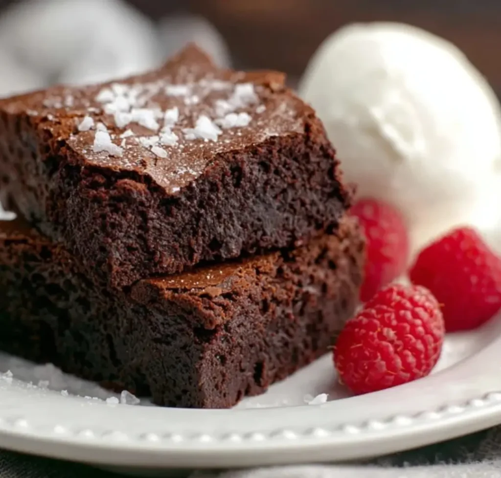 Three rich {{ $('Fetch Recipe Data').first().json["Main Keyword"] }} stacked on a plate with fresh raspberries and vanilla ice cream.