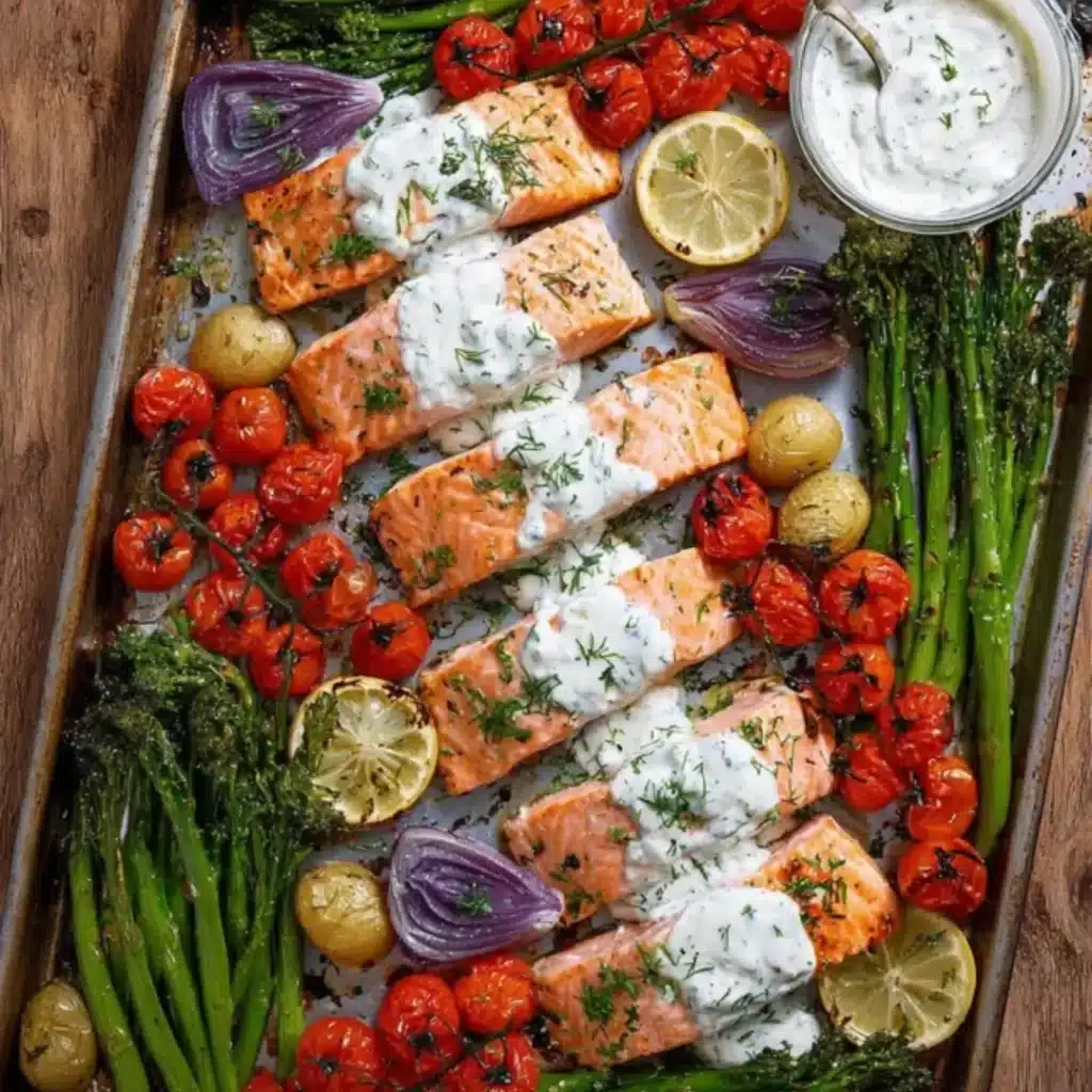 Sheet Pan Salmon with Roasted Vegetables and Creamy Feta Sauce