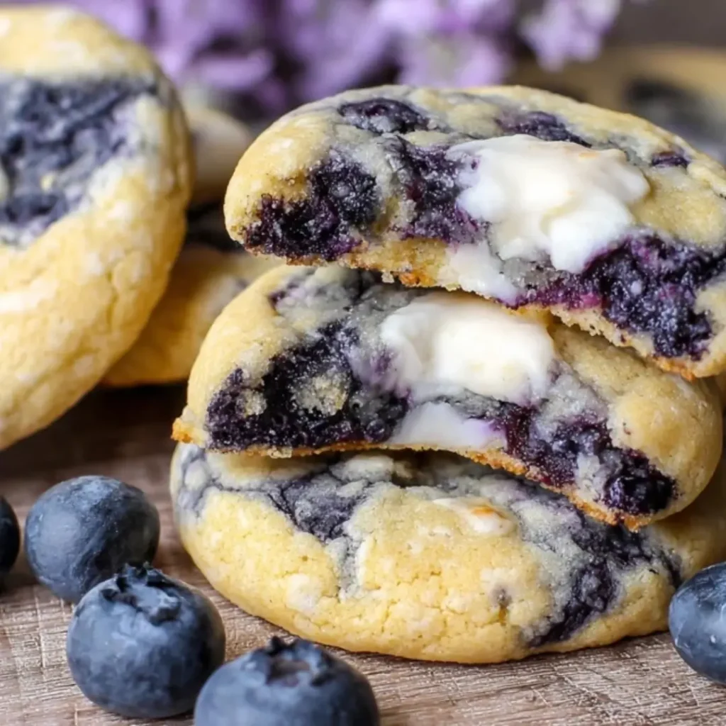 Indulge in the irresistible fusion of tangy cheesecake and sweet blueberries, baked into a soft, chewy cookie. These delightful treats capture all the beloved flavors of a blueberry cheesecake in a convenient, bite-sized form, perfect for any occasion.