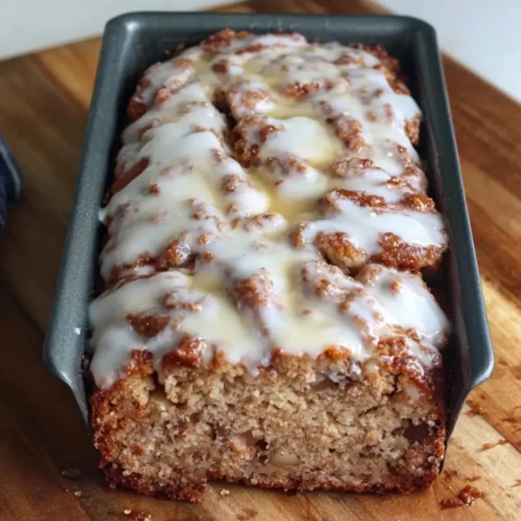 - Once the bread is completely cool, drizzle the glaze evenly over the top. Allow the glaze to set for a few minutes before slicing and serving.