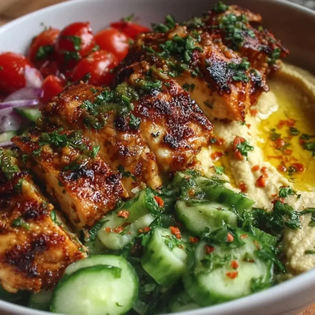 ![Close-up of a {{ $('Fetch Recipe Data').first().json["Main Keyword"] }} with grilled chicken, hummus, cucumbers, and red onion.](https://recipesdessert.net/wp-content/uploads/2026/03/spicy-garlic-chicken-bowl-with-hummus-and-cucumber-salad.webp)