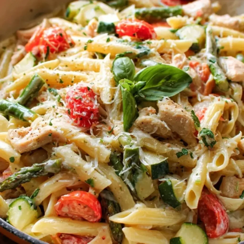 A vibrant and wholesome Chicken Pasta Primavera featuring tender chicken and a colorful medley of fresh vegetables, all tossed in a light and zesty lemon-garlic sauce. Perfect for a satisfying weeknight dinner.