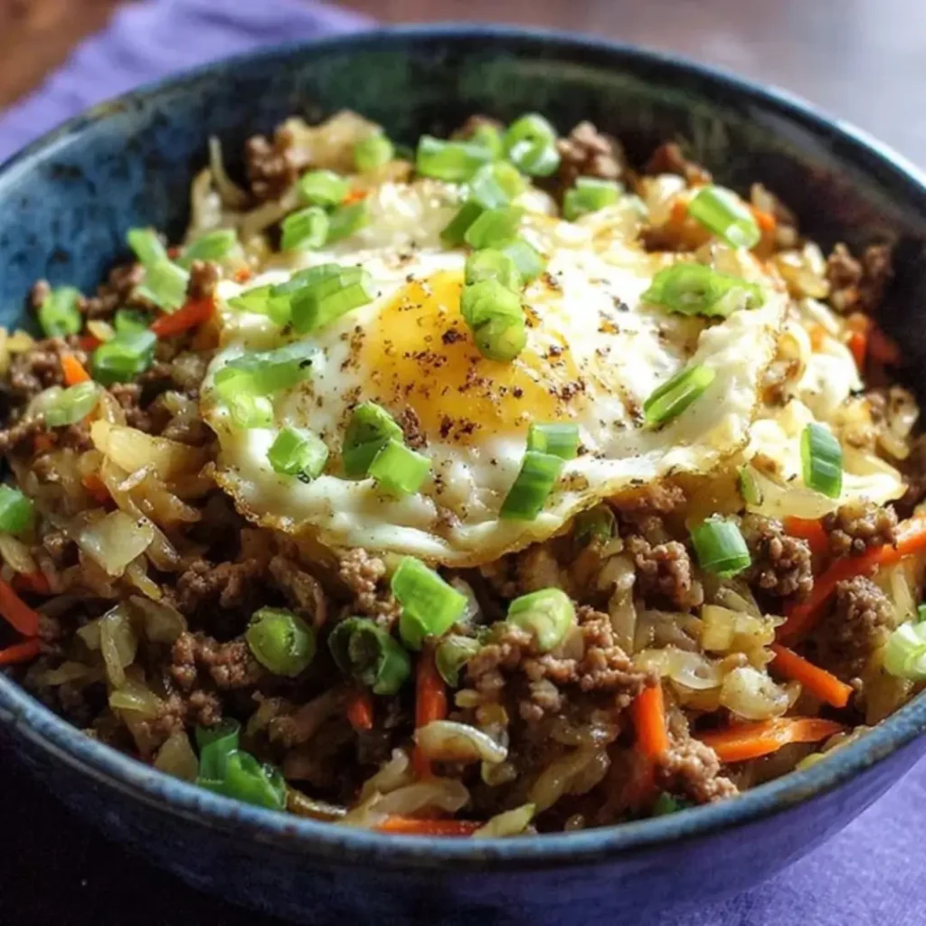 A delightful low-carb twist on a classic, this deconstructed egg roll features savory ground pork, tender cabbage, and a rich, umami sauce, all topped with a satisfying crunch of crispy pork rinds. It’s a quick, flavorful, and filling meal perfect for any keto diet.