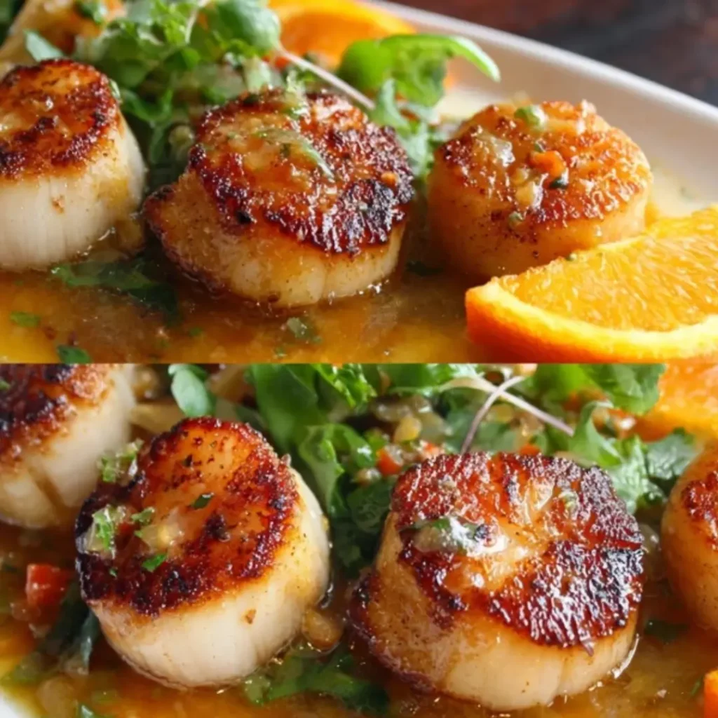 A close-up of perfectly pan seared scallops in a vibrant orange citrus sauce, garnished with fresh herbs.